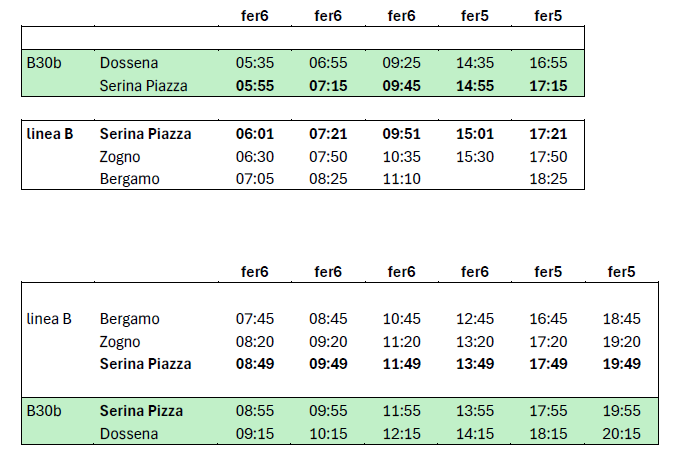 Pertanto, non sarà possibile effettuare il regolare percorso di linea, sarà garantito il collegamento con Dossena tramite corse sostitutive sulla tratta Dossena – Serina e ritorno in coincidenza con la linea B Passo Zambla – Zogno –Bergamo., indicato dal seguente orario: